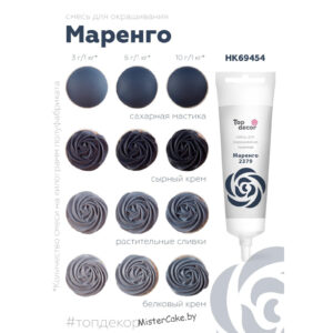 Концентрированный пищевой краситель применяется для окрашивания жидкостей, крема (масляного, белкового, заварного), мусса, желе, мармелада, джема, мороженого, взбитых сливок, теста, сахарной мастики и т. д. Основные преимущества гелевых красителей: окрашивают продукт, не изменяя структуры; легко смываются с рук при помощи воды и моющего средства; полностью готовы к применению; экономичны и удобны в использовании.