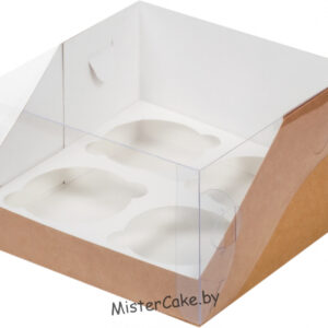 Упаковка на 4 капкейка с пластиковой крышкой 16*16*10см крафт