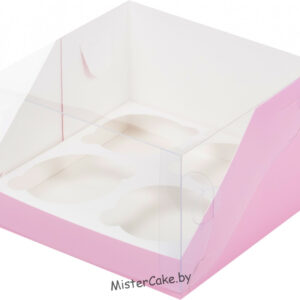 Коробка на 4 капкейка с пластиковой крышкой 16*16*10см розовая матовая